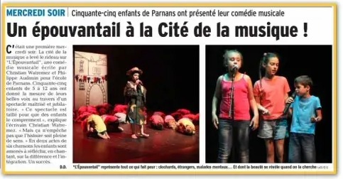 Un matin, lorsqu’ils arrivent à l’école, les élèves découvrent un épouvantail au milieu de la cour. Cet “intrus” va susciter des sentiments et des réactions contradictoires. Naissent des tensions si violentes qu’ils vont en venir aux mains. L’épouvantail, rejeté, décide de se laisser mourir. Voyant qu’il a disparu, les élèves se rassemblent autour de valeurs communes et décident de le chercher. Ils vont le retrouver au fond de la poubelle et découvrent qu’il est comme eux. L’enfant-épouvantail entonne un chant festif de son pays. Il est accueilli et intégré.